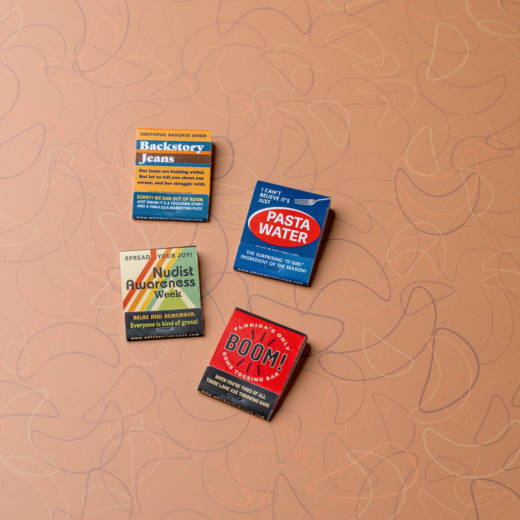 Includes 4 matchbooks: Backstory Jeans, Pasta Water, Nudist Awareness Week, and Boom! Bomb Tossing Bar.