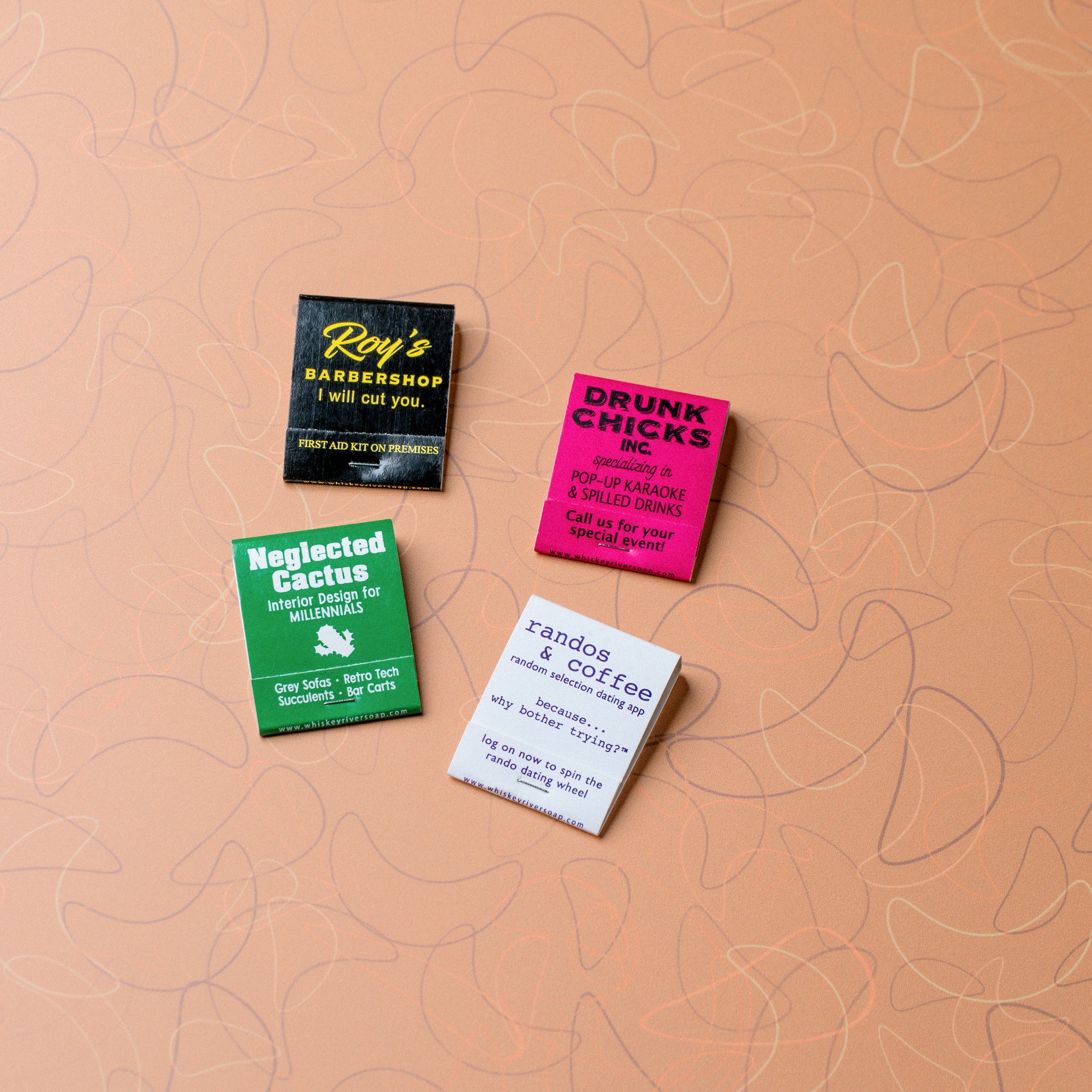 Includes 4 matchbooks: Drunk Chicks, Neglected Cactus, Randos & Coffee, and Roy's Barbershop.