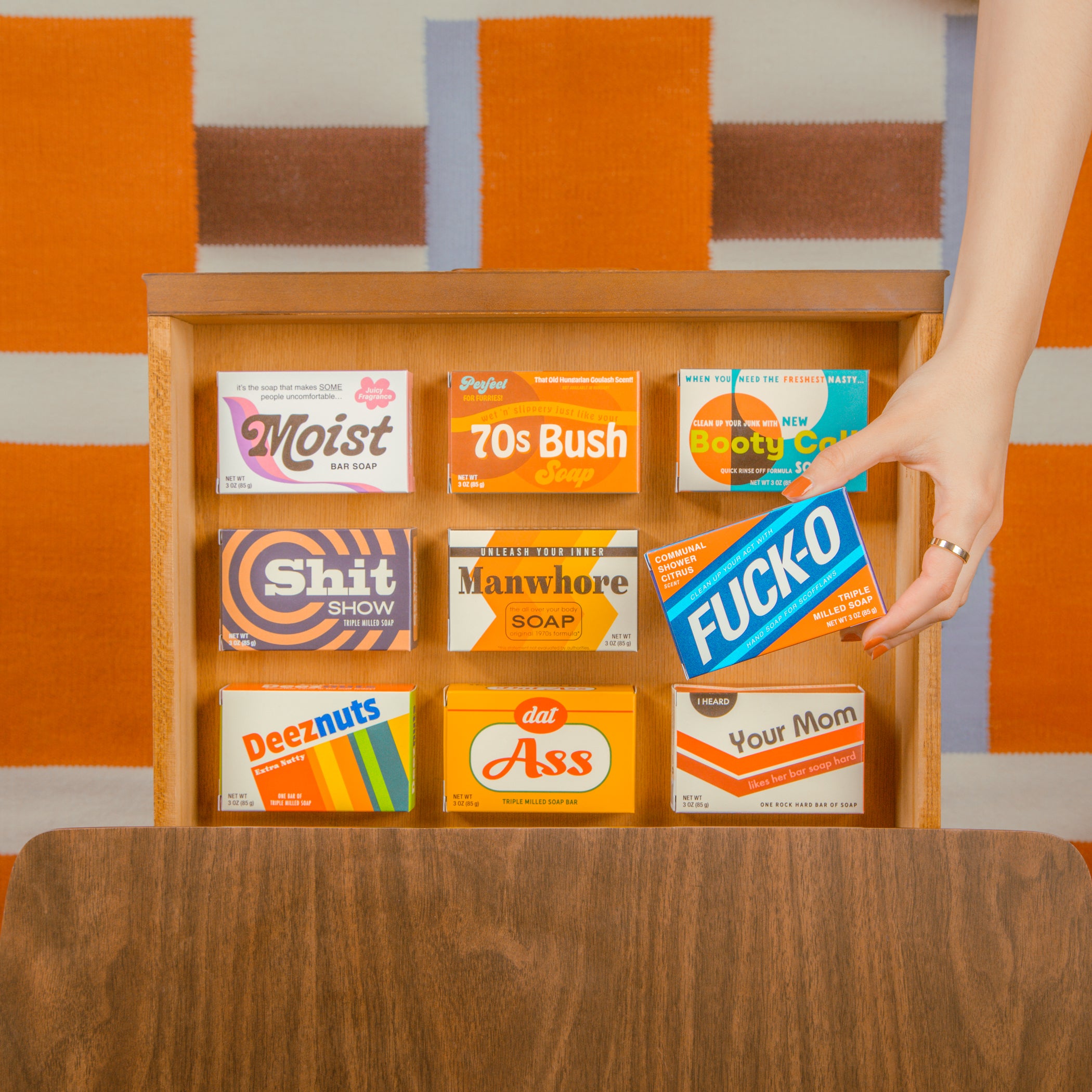 Triple-milled bar soap boxed in retro-inspired packaging.